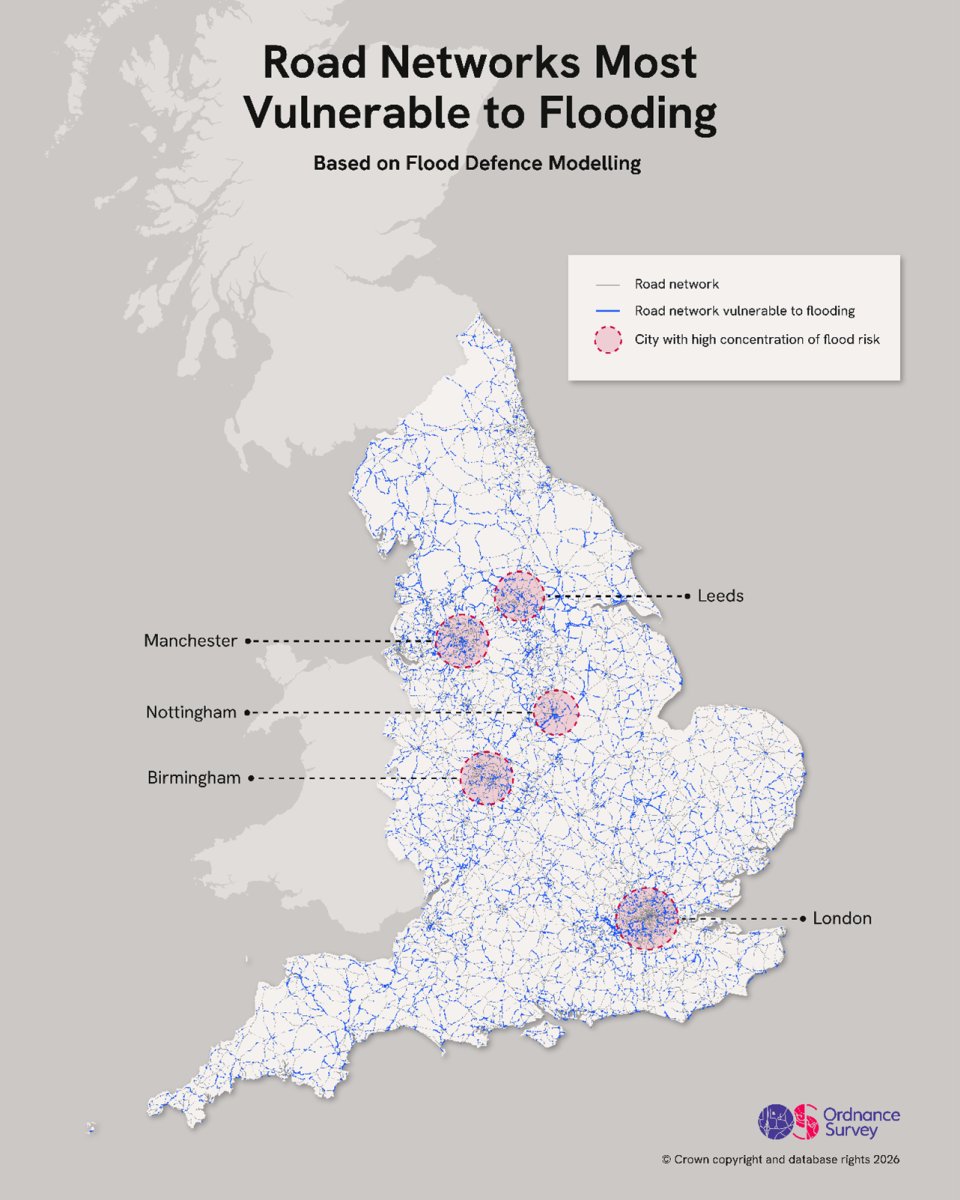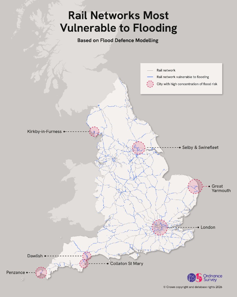 After a winter marked by storms, flood warnings and severe weather alerts, new analysis from Ordnance Survey (OS) has identified the road and rail pinch points across England most vulnerable to river and sea flooding, highlighting how climate-related events could isolate communities, disrupt critical transport networks, and leave England’s towns and cities partially, or completely cut off during extreme weather events.